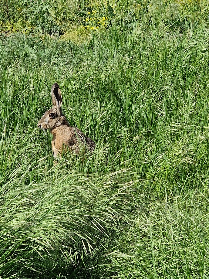 Kaszáltam a füvet lelkesen (hála Istennek volt mit...), és találtam két nyúlfiókát. Az egyik csendben volt, de a másik elkezdett sivalkodni. Erre odajött az anyjuk (addig nem vettem észre), egészen közelről szemlélte, mit csinálok. Persze a kicsiket békén hagytam, de azok nem mozdultak. A mama a képen látható szigorú tekintettel követett nyomon...